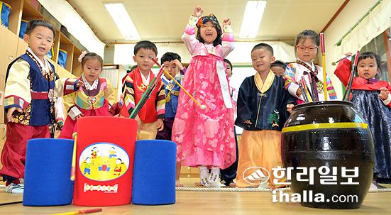 ▲제주시 밝은뜨락어린이집 원아들이 색동 한복을 곱게 차려입고 전통민속놀이 체험을 하며 즐거운 시간을 보내고 있다. 강경민기자