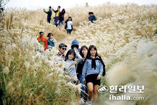 제주섬 전역이 억새꽃의 은빛 물결로 넘쳐나고 있다. 섬 곳곳에 그들만의 세상을 만들어내며 수줍은 듯 고개를 내리고 바람을 피하는 억새의 장관은 제주섬이 간직한 가을의 비경이다. 중산간 지역을 고집하지 않더라도 시내권만 벗어나면 억새를 쉽게 찾아볼 수 있다는 것 자체가 제주만이 갖고 있는 가을의 행복이다.