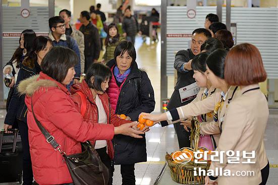2014년 갑오년을 맞아 중국 마카오발 이스타항공이 1일 오전 6시5분에 제주국제공항에 도착해 첫 입도 중국인관광객들을 제주도관광협회 직원들이 환영인사를 하고 있다./사진= 강경민기자 photo6n6@ihalla.com
