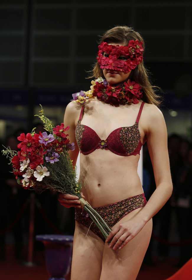 14일(현지시간) 홍콩의 '패션위크 엑스포' 행사에서 현지 브랜드 '스카이-하이 언더웨어'의 한 모델이 가면을 한 채 브래지어 등 여성 속옷류를 선보이고 있다.연합