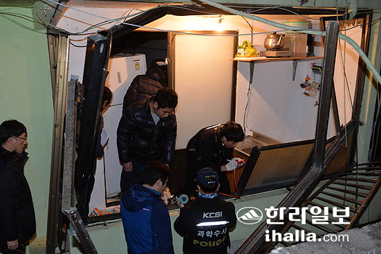 | 과학수사대원들이 가스 폭발 현장에서 정밀감식을 벌이고 있다. |