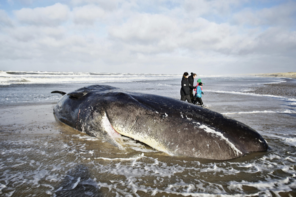 16일(현지시간) 덴마크 서부 해안 에스 비에르의 북쪽 헨네 해변에 떠밀려 온 향유 고래. 연합뉴스