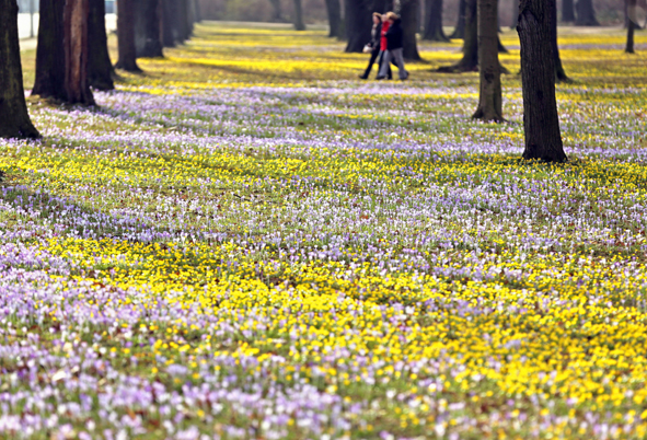 사람들이 26일(현지시간) 독일 드레스덴의 사프란과 노랑너도바람꽃이 만개한 공원에서 산책을 즐기고 있다. 연합뉴스