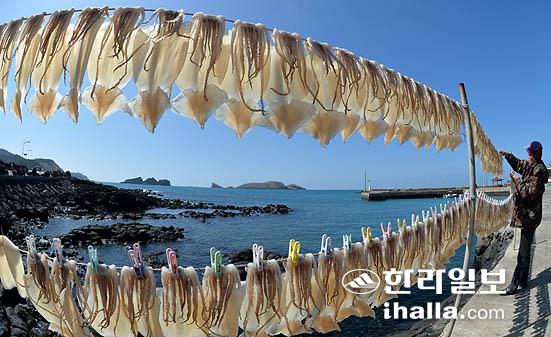 10일 제주시 한경면 용수포구에는 봄 햇살이 내리쬐는 파란하늘 아래 한 어민이 오징어말리기 작업이 한창이다. 강경민기자 photo6n6@ihlla.com
