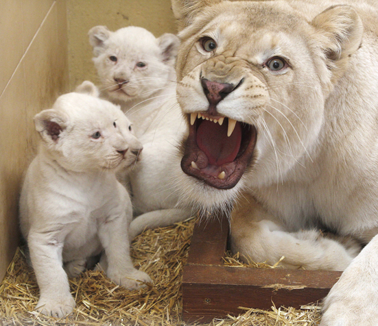 11일(현지시간) 폴란드 보리세브의 한 개인 동물원에서 휜사자 새끼 3마리가 어금니를 드러낸 어미의 얼굴을 쳐다보고 있다. 지난 1월말 태어난 이들 사자 새끼는 오는 4월부터 실외 생활을 하면서 5월엔 일반에 공개될 예정. 연합뉴스