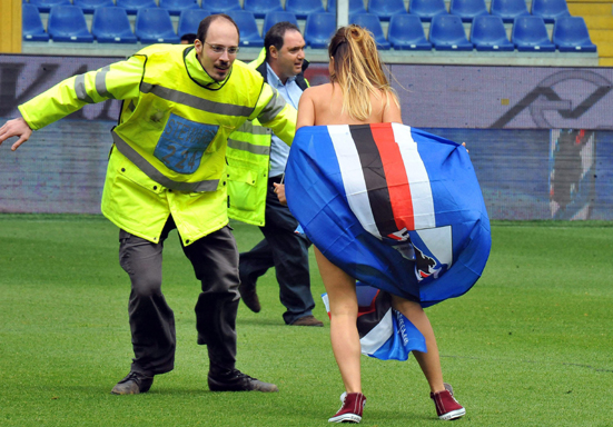 11일(현지시간) 열린 이탈리아 세리에A 삼프도리아와 나폴리간 축구경기에서 한 여성이 경기장에 난입하자 청경들이 여성을 붙잡으려고 하고 있다. 연합뉴스