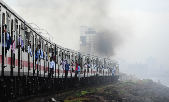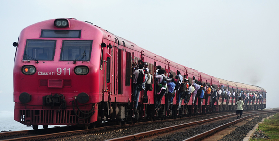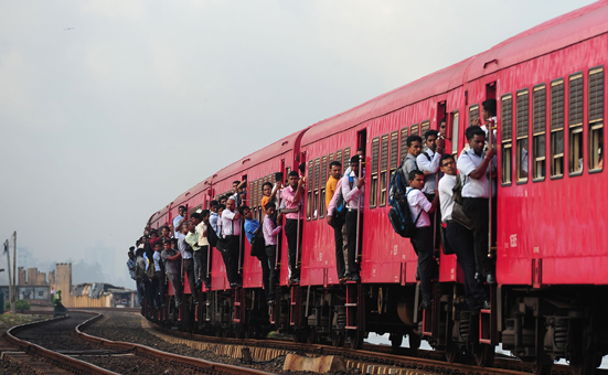 여객 열차 측면에 아슬아슬하게 매달려 가는 스리랑카 기차여행객들. 연합뉴스