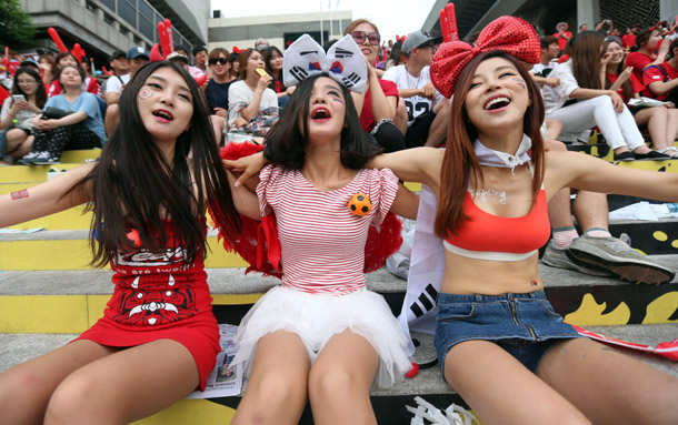 ▲18일 브라질월드컵 한국과 러시아의 경기를 응원하기 위해 서울 광화문 광장에 모인 축구팬들이 중계방송을 지켜보며 한국팀을 응원하고 있다. 연합뉴스