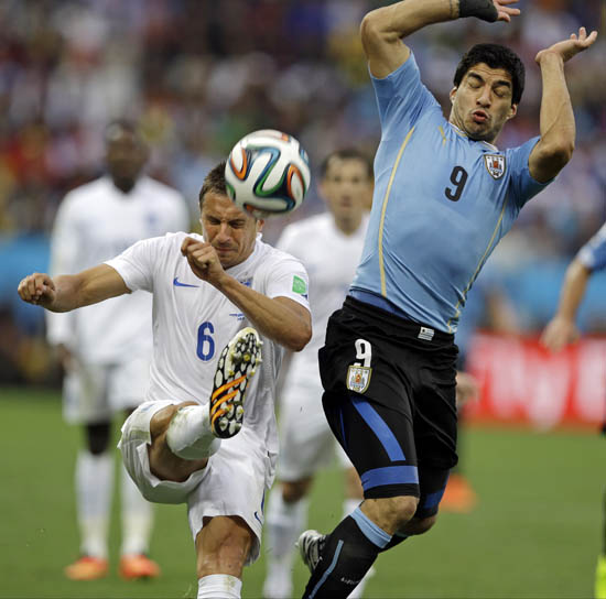 19일(현지시간) 브라질 상파울루의 코린치앙스 경기장에서 벌어진 월드컵 조별리그 D조 2차전에서 잉글랜드의 필 자기엘카(왼쪽)가 강력하게 공을 차내자 옆에 있던 우루과이의 루이스 수아레스가 깜짝 놀라 몸을 피하고 있다. 연합뉴스
