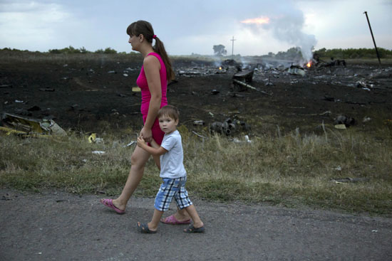 ▲미사일에 격추돼 탑승자 전원이 사망한 17일(현지시간) 우크라이나 동부 그라보보의 말레이시아항공 보잉777 여객기 추락현장 옆 길을 한 여성이 아들 손을 잡고 지나고 있다. 이곳은 우크라이나 정부군과 교전 중인 친러시아 분리주의 반군 장악 지역으로 양측은 이번 격추가 상대방의 소행으로 주장하고 있다. 연합뉴스