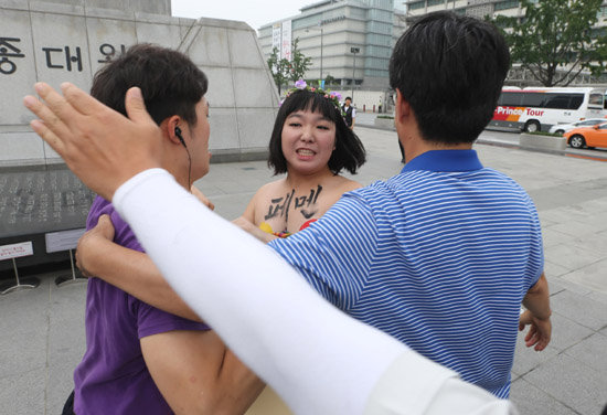 ▲여성 운동단체 '페멘(FEMEN)' 한국지부 한 관계자가 21일 오후 서울 종로구 광화문광장 세종대왕상 앞에서 세월호 특별법 제정을 촉구하는 토플리스(topless.반라) 시위를 벌이다 경찰에 제지당하고 있다. 연합뉴스