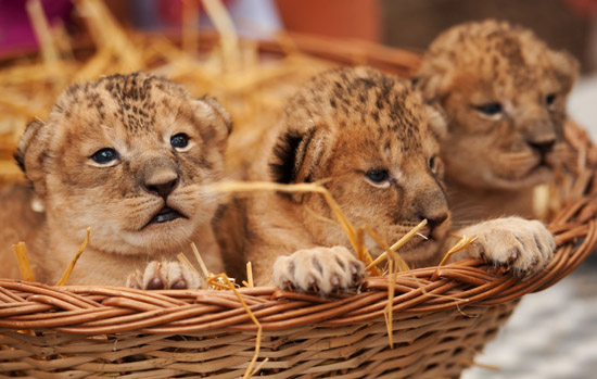 ▲2일(현지시간) 독일 호덴하겐의 세렌니공원 동물원에서 대바구니에 담긴 사자 새끼 3형제가 나란히 밖을 바라보고 있다. 레온, 론카 및 레오노라로 이름지어진 이 세마리는 지난 달 21일 태어났다고. 연합뉴스