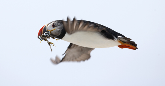 | ▲미국 메인주의 작은 섬 이스턴 에그 락에서 1일(현지시간) 애틀랜틱 바다오리 한 마리가 물고기를 입에 잔뜩 문 채 새끼들에게 날아가고 있다. 연합뉴스 |
