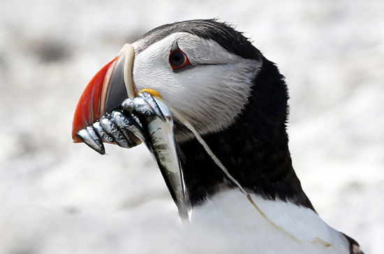▲미국 메인주의 작은 섬 이스턴 에그 락에서 1일(현지시간) 애틀랜틱 바다오리 한 마리가 물고기를 입에 잔뜩 문 채 새끼들에게 돌아갈 준비를 하며 주위를 살피고 있다. 연합뉴스