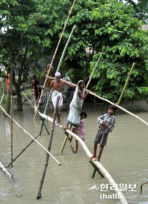 폭우로 홍수가 난 인도 아삼주 북부 모리가온에서 주민들이 18일(현지시간) 대나무를 이용한 간단한 구조물을 설치, 불어난 물을 건너고 있다. 인도와 네팔에서는 사흘간 내린 폭우로 곳곳에서 홍수와 산사태가 발생하면서 지금까지 180여 명이 숨진 것으로 알려졌다. 연합뉴스