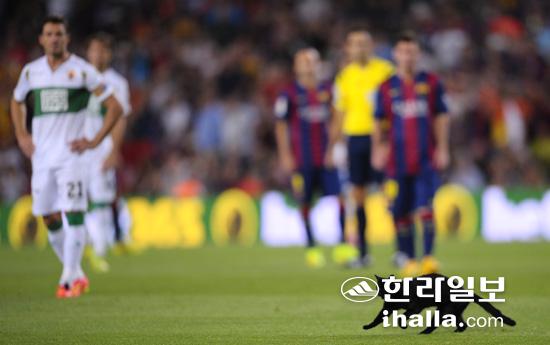 ▲24일(현지시간) 스페인 프로축구 FC바르셀로나-엘체 경기가 열린 바르셀로나의 캄푸 누 스타디움 그라운드에 검은 고양이 한 마리가 찾아 들었다. 연합뉴스