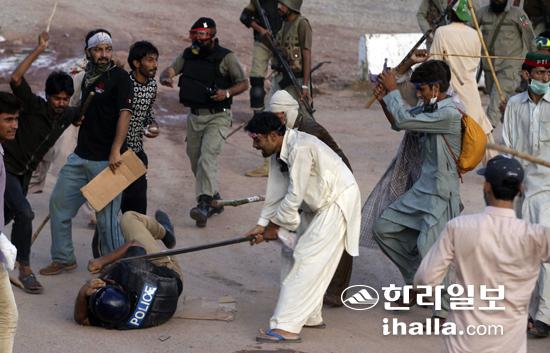 파키스탄 수도 이슬라마바드에서 나와즈 샤리프 총리의 퇴진을 요구하는 시위가 3주째 계속되는 가운데 1일(현지시간) 진압에 나섰던 한 경찰관이 시위자들에게 둘러싸여 뭇매를 맞고 있다. 연합뉴스