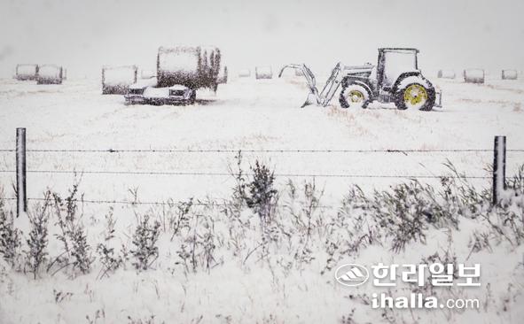 8일(현지시간) 강설 주의보가 발효된 캐나다 앨버타주 크레모나의 한 농장에서 건초와 트랙터에 눈이 쌓여 있다. 연합뉴스