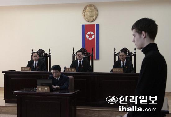 북한에 6개월째 억류돼 있는 미국인 관광객 매튜 토드 밀러(오른쪽)가 14일(현지시간) 평양의 최고재판소에서 재판을 받고 있다. 최고재판소는 이날 밀러에게 불법입국과 간첩죄를 적용해 6년 노동교화형을 선고했다. 연합뉴스