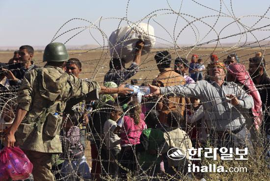이슬람 급진주의 무장세력 '이슬람국가'(IS)의 공격을 피해 터키 국경지대 수루크로 몰려와 입국 허용을 기다리는 시리아 북부 쿠르드족 주민들에게 21일(현지시간) 터키 군인이 물병을 건네고 있다. 연합뉴스