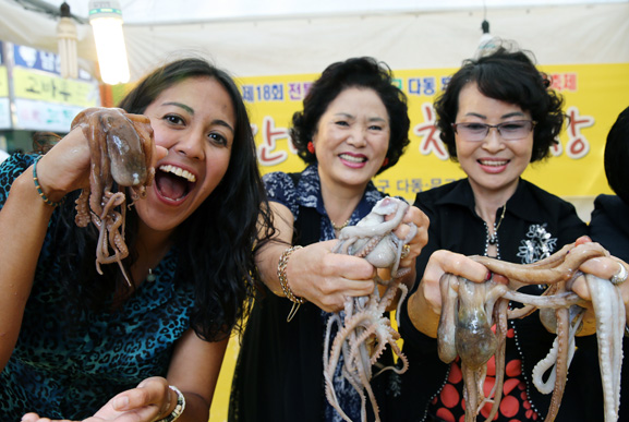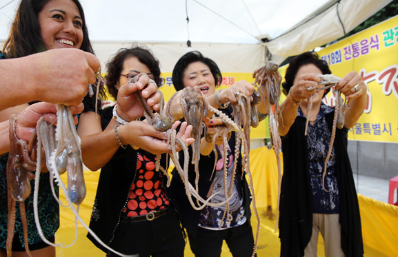 | '다동·무교동 음식문화 가을대축제'(27일부터 10월25일까지)을 앞두고 중구청과 다동·무교동번영회가 외국인 관광객과 시민들을 위한 산낙지잡기 체험 행사를 개최, 25일 오후 서울 다동 행사장에서 참가자들이 직접 잡은 낙지를 들어 보이고 있다. 사진=연합뉴스 |