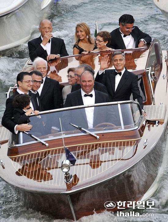 레바논 출신 영국 변호사 아말 알라무딘과 결혼식을 올릴 미국 영화배우 조지 클루니(53, 앞 오른편)가 27일(현지시간) 이탈리아 베니스에서 수상택시로 식장인 아만 호텔로 향하면서 손을 흔들고 있다. 그의 부친 닉 클루니(앞 오른편에서 5번째), 모친 니나 브루스(뒤 오른편에서 2번째) 등도 함께 승선해 있다. 연합뉴스