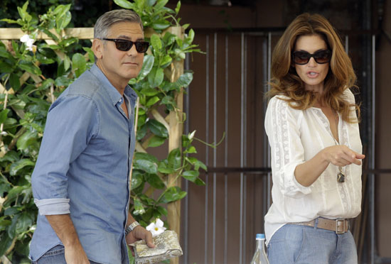 | 미국 영화배우 조지 클루니(53, 왼쪽)가 27일(현지시간) 결혼 축하연을 연 이탈리아 베네치아소재 치프리아니 호텔 정원에서 모델 신디 크로퍼드와 모습을 보이고 있다. 클루니는 로마 시장을 지낸 오랜 친구 월터 벨트로니의 주례로 베네치아 시청에서 29일 레바논 출신 영국 변호사 아말 알라무딘(36)와 결혼식을 올린다. 연합뉴스 |