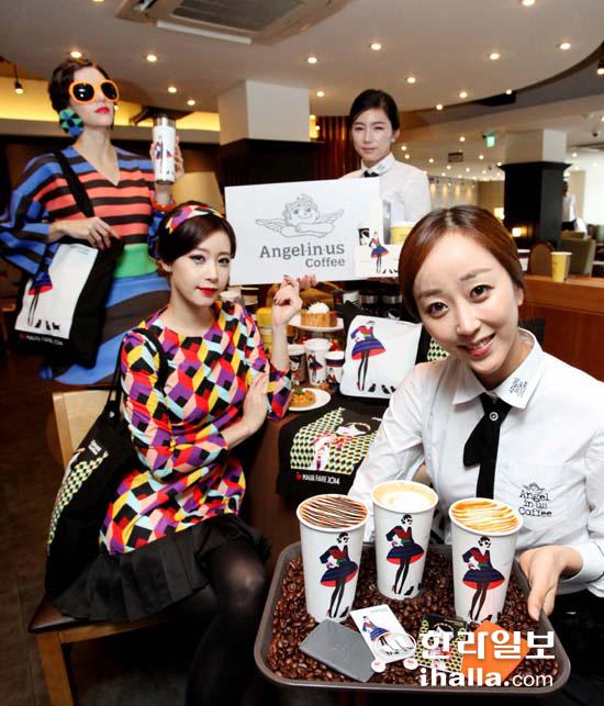 30일 서울 엔제리너스커피 광화문 매장에서 프랑스 그래픽 아티스트 '말리카 파브르'의 콜라보레이션 작품을 재현한 모델들이 콜라보레이션 기획상품과 가을 신제품을 선보이고 있다. 연합뉴스