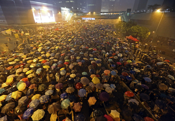 우산으로 경찰의 최루액과 최루탄 가스를 버텨내 '우산혁명'으로 불리고 있는, 이번 시위사태는 민주화 요구 수용 및 렁춘잉(梁振英) 행정장관 퇴진 등 시위대의 '최후통첩' 시한인 다음날 고비를 맞을 것으로 보인다. 사진=연합뉴스