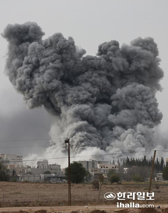 시리아 코바니 지역에서 이곳 거주 쿠르드족과 이슬람 수니파 무장단체 이슬람국가(IS) 간의 교전이 격화되고 있는 가운데 12일(현지시간) 미국 주도의 국제연합전선이 코바니에 대한 공습을 퍼붓자 검은 연기가 상공으로 치솟고 있다. 연합뉴스