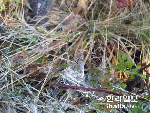 15일 경남 산청의 지리산국립공원사무소 관할구역인 장터목대피소에 올해 들어 처음 얼음이 얼었다. 연합뉴스
