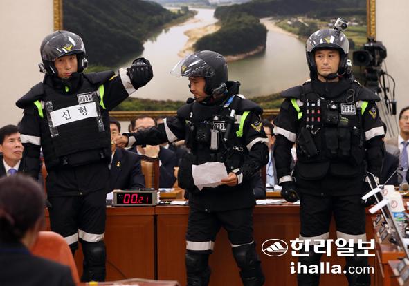 15일 국회 농림축산식품해양수산위원회에서 진행된 해양수산부·해양경찰청 등에 대한 국정감사에서 새누리당 이종배 의원의 질의 도중 해양경찰관들이 중국 어선 단속 시 착용하는 진압복의 신형(왼쪽)과 구형을 비교해서 보여주고 있다. 연합뉴스