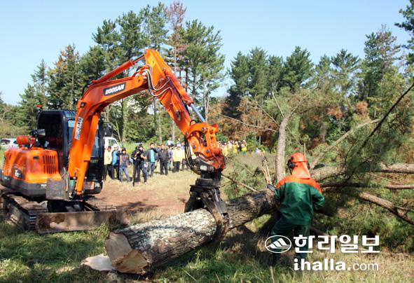 15일 제주시 오등동 오등봉에서 제주도 소나무재선충병 방제대책본부가 소나무재선충병 확산 방지를 위한 발대식을 연 뒤 재선충병에 감염돼 고사한 소나무 방제작업 시연을 하고 있다. 연합뉴스