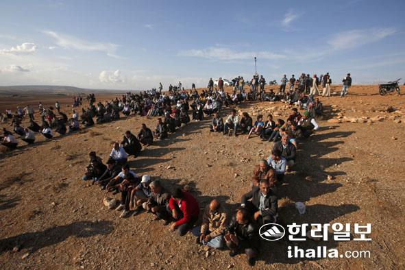 시리아 코바니에서 이슬람 극단주의 무장세력 '이슬람국가'(IS)와 교전하고 있는 시리아 쿠르드족을 격려하기 위해 15일(현지시간) 터키 거주 쿠르드족들이 터키 수루치 외곽 언덕에 모여 국경 너머 전투현장을 지켜보고 있다. IS와 시가전을 벌이는 쿠르드 민병대 '인민수비대'의 약자인 'YPG'를 나타내는 형태로 앉아 있는 모습이 인상적이다. 연합뉴스