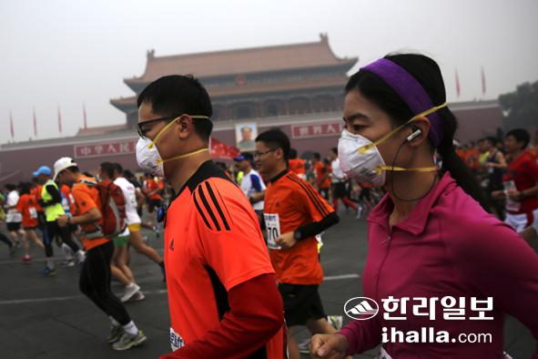 19일(현지시간) 중국 베이징에서 개최된 2014 베이징 국제마라톤 대회에서 일부 참가자들이 연무가 가득 낀 톈안먼 광장을 마스크를 쓰고 달리고 있다. 연합뉴스