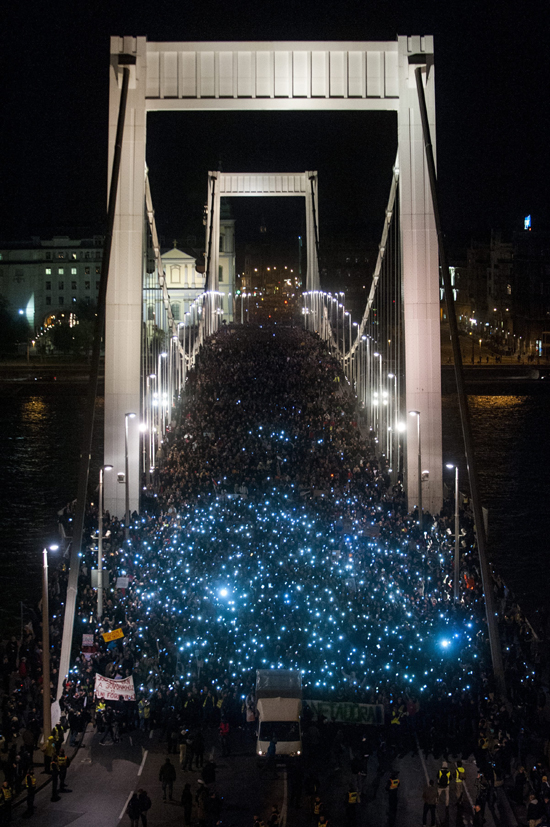 헝가리 정부가 2015년부터 인터넷 사용에 세금을 물리려는 방침을 세우자 이에 반발한 수천 명의 시민들이 28일(현지시간) 수도 부다페스트의 엘리자베스 다리 위에서 휴대폰을 켠 채 항의 행진을 벌이고 있다. 연합뉴스