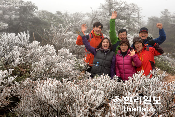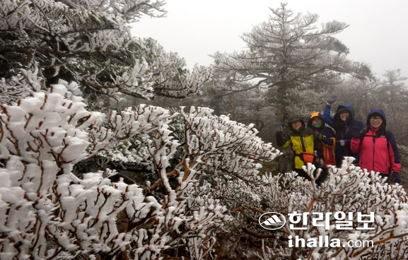 기습적인 늦가을 한파가 몰아닥친 3일 한라산 윗세오름일대의 기온이 영하권으로 떨어지며 선작지왓 나무 가지마다 얼음 꽃인 상고대가 맺혀 장관을 이루고 있다. 강경민기자