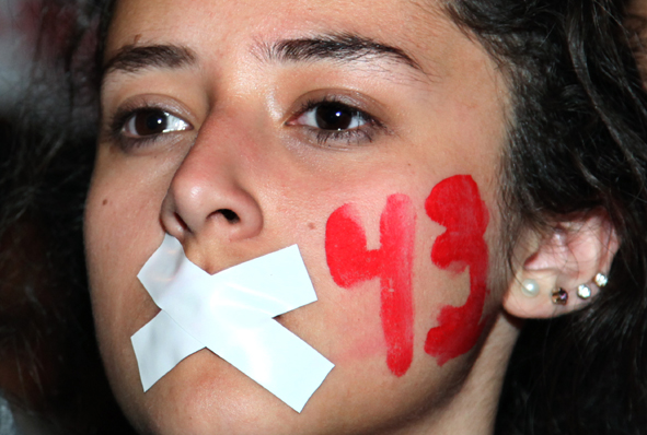 멕시코 실종 대학생 43명의 행방이 사건발생 40일이 지나도록 오리무중인 가운데 5일(현지시간) 수도 멕시코시티에서 한 학생이 실종학생 숫자를 나타내는 '43'을 붉은 페인트로 얼굴에 그린 채 입에 테이프를 붙이고 가두 시위에 참가하고 있다. 연합뉴스