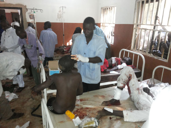 나이지리아 포티스쿰의 국립종합과학고등학교에서 10일(현지시간) 교복차림으로 위장한 자살폭탄 테러리스트가 아침 조회 장소에 폭탄을 터뜨려 최소 48명이 숨지고 70여명이 부상했다고 현지 의료관계자들이 말했다. 이 학교는 서구식 커리큘럼을 가르치는 곳이어서 이번 사건이 서구식 교육을 죄악시하는 이슬람 무장반군 보코하람에 의해 자행됐을 가능성이 높은 것으로 분석되고 있다. 사진은 부상자들이 인근 병원으로 옮겨져 치료받고 있는 모습. 연합뉴스