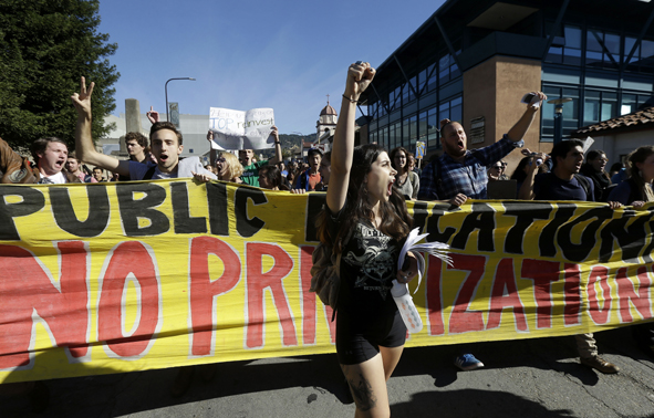 미국 캘리포니아주립대학(UC) 이사회가 향후 5년간 수업료를 매년 5% 인상키로 의결하자 버클리 캘리포니아대(UC 버클리) 학생들이 24일(현지시간) 버클리에서 수업을 거부한 채 항의 시위를 벌이고 있다. 연합뉴스