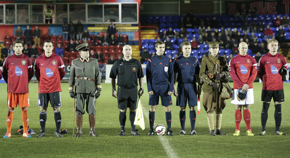17일(현지시간) 영국 잉글랜드의 올더숏에서 1차 세계대전 당시 크리스마스 때 대치하던 양국 부대간 휴전 및 축구시합을 기념하는 경기에 앞서 붉은 운동복 차림의 양측 선수와 당시 군복을 입은 장교(왼쪽이 독일 진영)가 심판들과 포즈를 취하고 있다. 1914년 성탄절 전야와 당일 이틀 동안 일시적 휴전에 합의하자 양측 병사들은 서부 전선 곳곳의 참호에서 나와 대화를 나누거나 담배를 주고받았으며 허허벌판에서 축구공을 차기도 했다. 연합뉴스