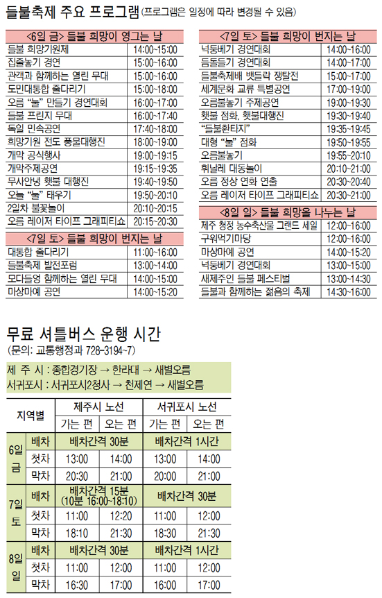 이번 축제는 방애불 놓기의 정신을 살려 서귀포시민 쉼터 부스를 마련하고, 외국인을 위한 전용카페를 운영한다. 들불축제와 연계해 도내 관광지에 대해 관광객과 도민을 대상으로 할인혜택도 제공한다. 고질적인 주차난과 교통난을 다소나마 해소하기 위해 새별오름 일대에 승용차 1만여대가 동시 주차할 수 있는 주차장을 확보하고, 제주시와 서귀포시를 오가는 무료 셔틀버스도 확대 운영한다.