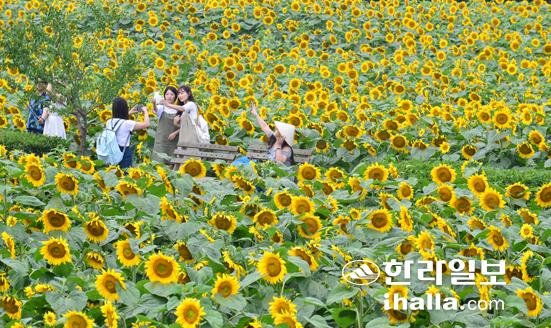 장마전선이 일시 남하하면서 화창한 날씨를 보인 2일 관광객과 도민들이 제주시 회천동의 한 농장에 활짝 핀 수 만 송이의 해바라기꽃밭을 거닐며 즐거운 시간을 보내고 있다. 강희만기자