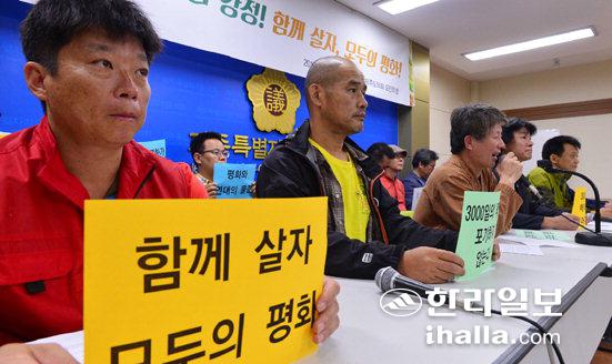강정마을회와 제주해군기지 건설 저지를 위한 전국대책회의(이하 대책회의) 등 제주해군기지 반대단체 4곳은 7일 제주도의회 도민의 방에서 기자회견을 열어 '2015 강정생명평화대행진'의 구체적인 일정과 행사 목적 등을 설명했다. 강희만기자