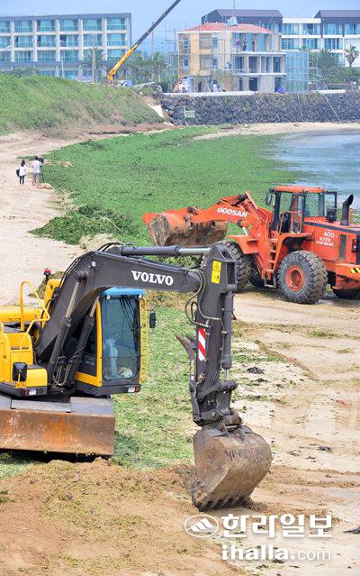 14일 서귀포시 성산읍 시흥리 해안에 청정 제주바다 이미지를 흐리게 하고 있는 파래 수거를 위해 행정당국에서 중장비를 동원해 수거작업을 벌이고 있다. 강희만기자