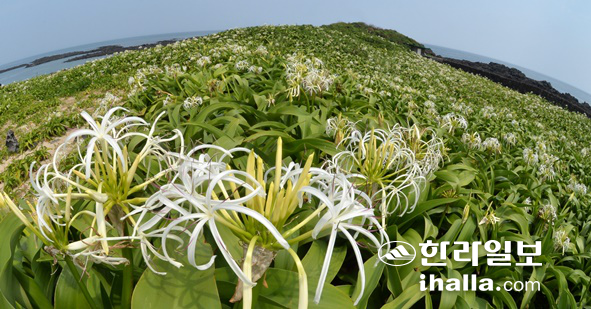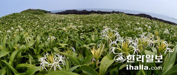 29일 제주시 구좌읍 하도리 토끼섬에는 연일 계속되는 폭염에 아랑곳하지 않고 새하얀 문주란꽃이 꽃망울을 활짝 터트려 고운 자태를 뽐내고 있다. 강경민기자