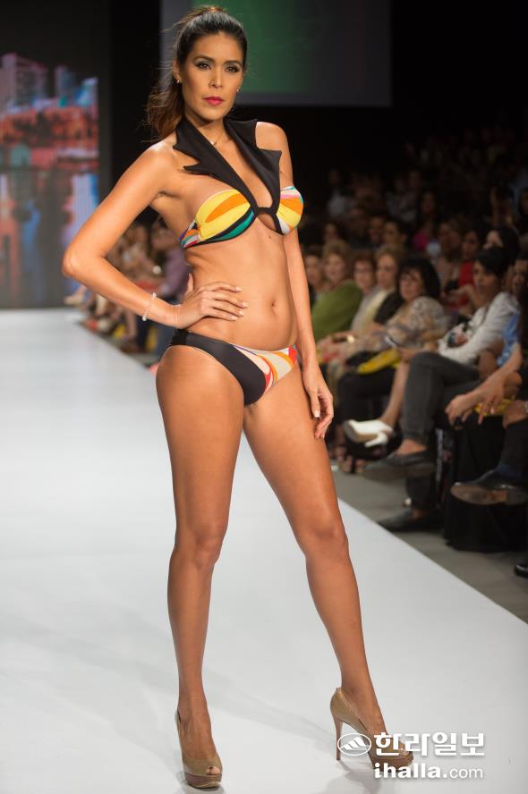 최근 도미니카공화국의 산토도밍고에서 열린 Dominicana Moda2015에서 한 모델이 도미니카 디자이너인 Rubenny Garcia의 브랜드 Salitre Swimwear을 선보이고 있다.