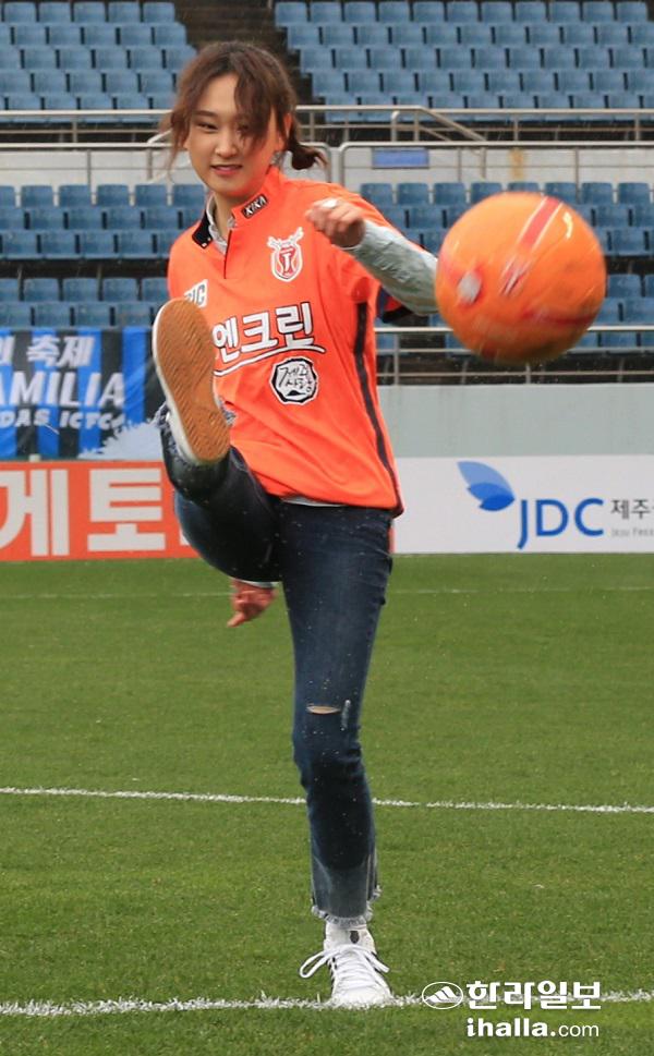 13일 제주월드컵경기장에서 열린 현대오일뱅크 K리그 클래식 2016 1라운드 제주유나이티드와 인천유나이티드의 경기에 앞서 드라마 '응답하라 1988'에서 '성보라'역을 맡았던 류혜영이 시축하고 있다./제주자치도 제공