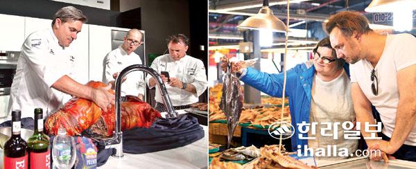 지난 5월 열흘간 개최된 '제2회 제주 푸드앤와인페스티벌'에서 국내·외 최정상급 셰프들이 제주의 식재료를 활용해 요리를 선보이고 있다(사진 왼쪽).'제주 푸드앤와인페스티벌'에 참가한 셰프들이 제주전통시장을 찾아 식재료를 살펴보고 있다(오른쪽).