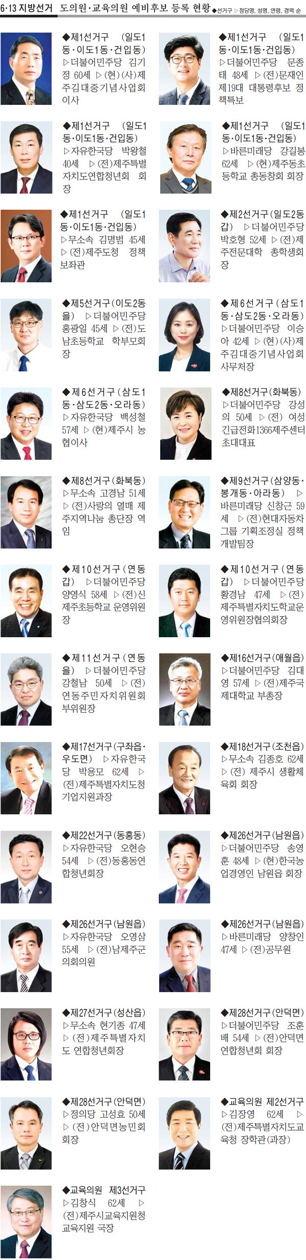 선거구별로는 제1선거구(일도1동·이도1동·건입동)에 더불어민주당 김기정(60)·문종태(48), 자유한국당 박왕철(40), 바른미래당 강길봉(62), 무소속 김명범(45) 예비후보가 등록을 마쳐 가장 치열한 경쟁을 예고했다. 이어 제26선거구(남원읍)에 더불어민주당 송영훈(48), 자유한국당 오영삼(55), 바른미래당 양창인(47) 예비후보가 등록해 1선거구에 이어 가장 많은 후보들이 등록했다.